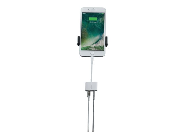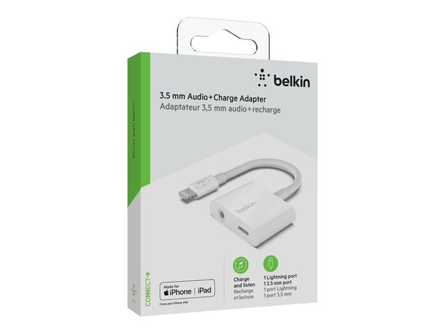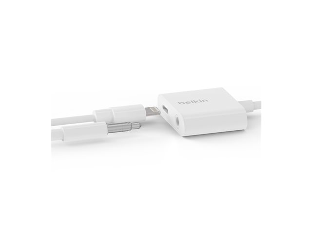 Belkin 3.5 mm Audio + Charge RockStar - Lightning to headphone jack / lataussovitin - Lightning uros to 4-pole mini jack, Lightning naaras - valkoinen
