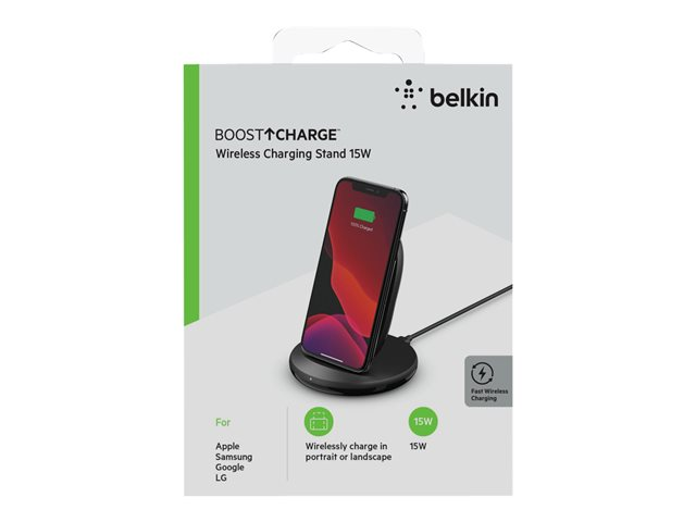 Belkin BoostCharge - Langaton latausalusta + AC-virtasovitin - 15 watti(a) - musta malleihin Apple iPhone 11, 11 Pro, 11 Pro Max, 8, 8 Plus, X, XR, XS, XS Max; Samsung Galaxy Note10, Note10+, S10, S10+, S10e